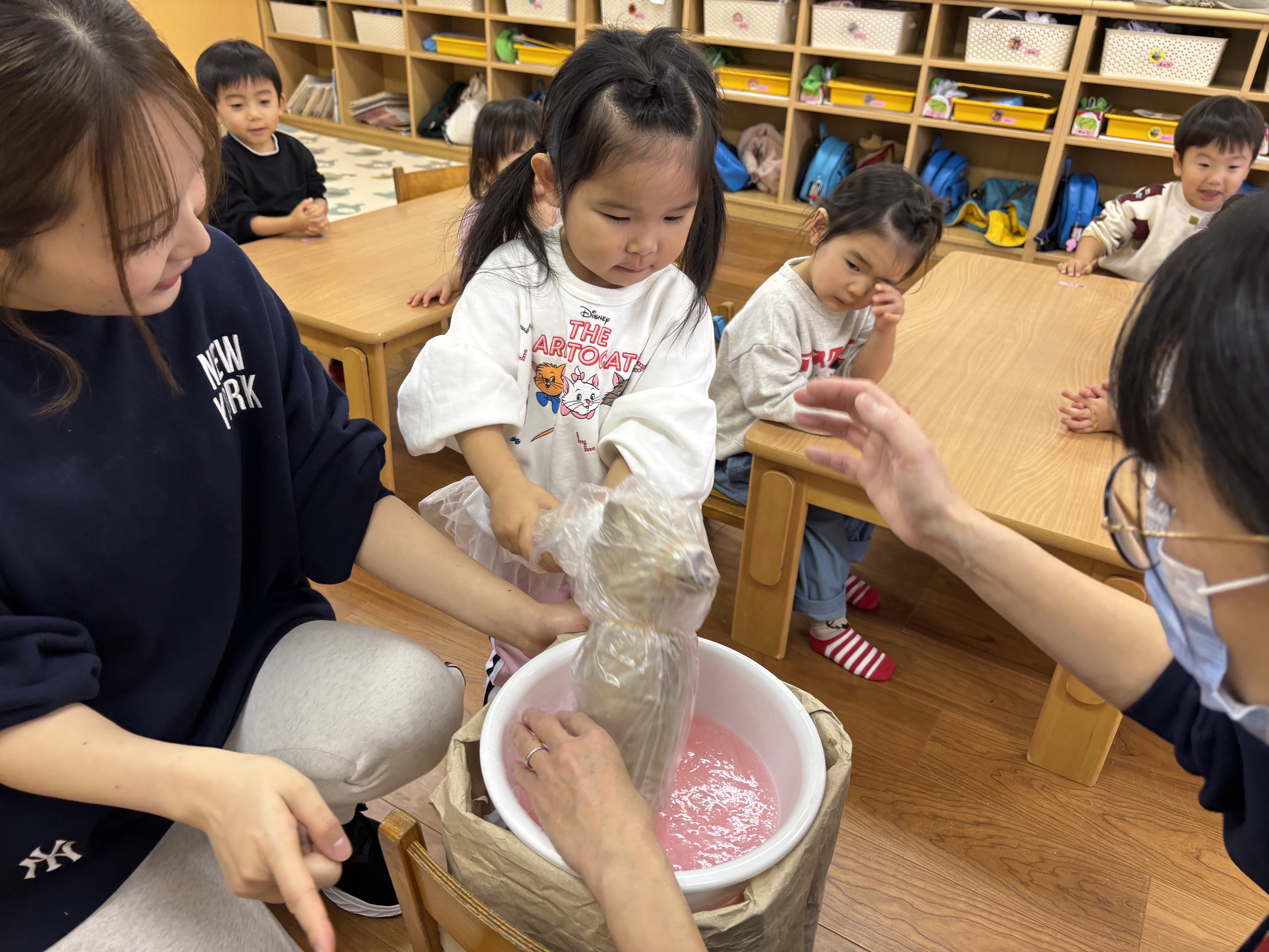 その後はスライム遊びをし「おててにくっつく!」「びよーんって伸びるよ!」と大はしゃぎのお友だち。