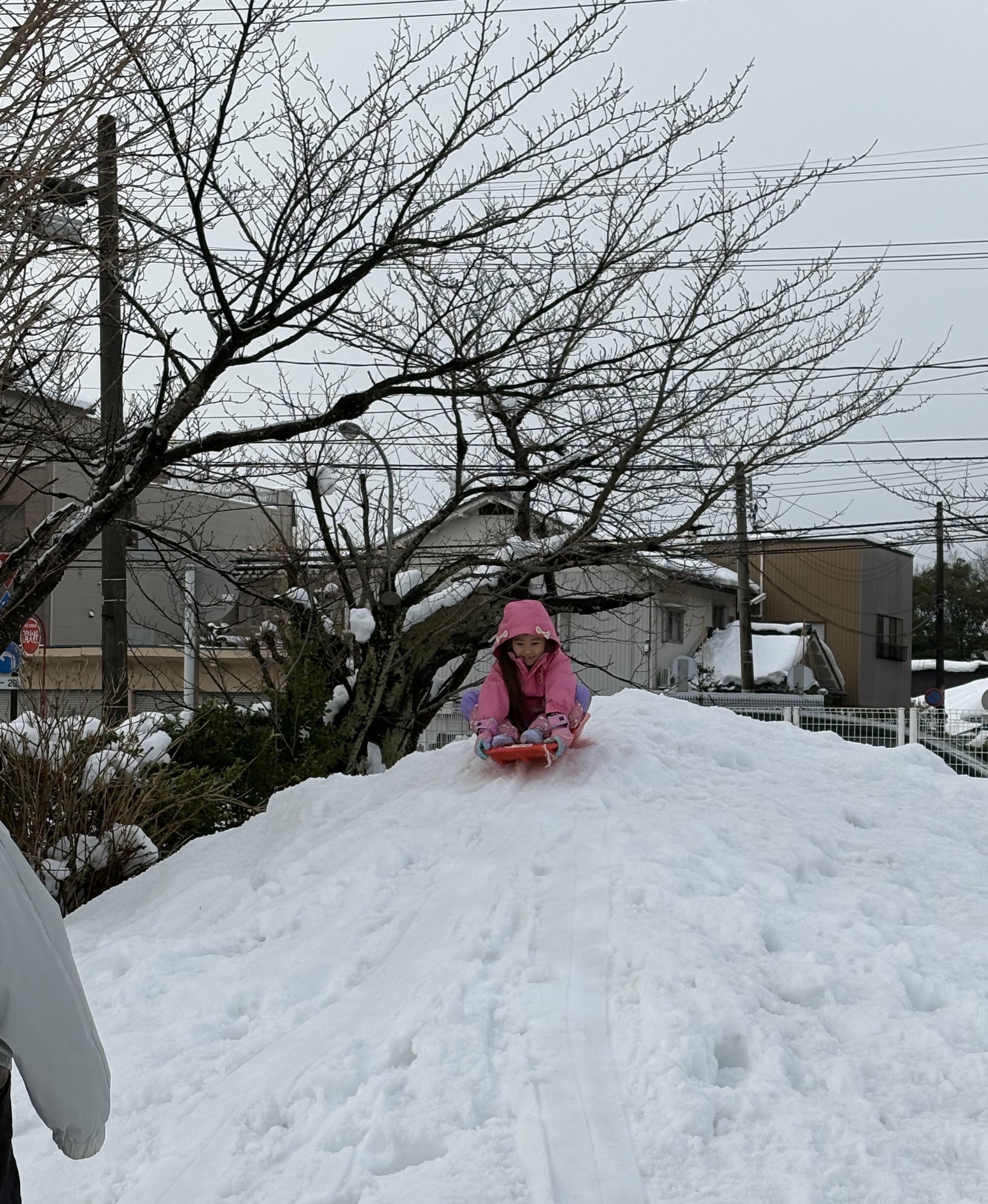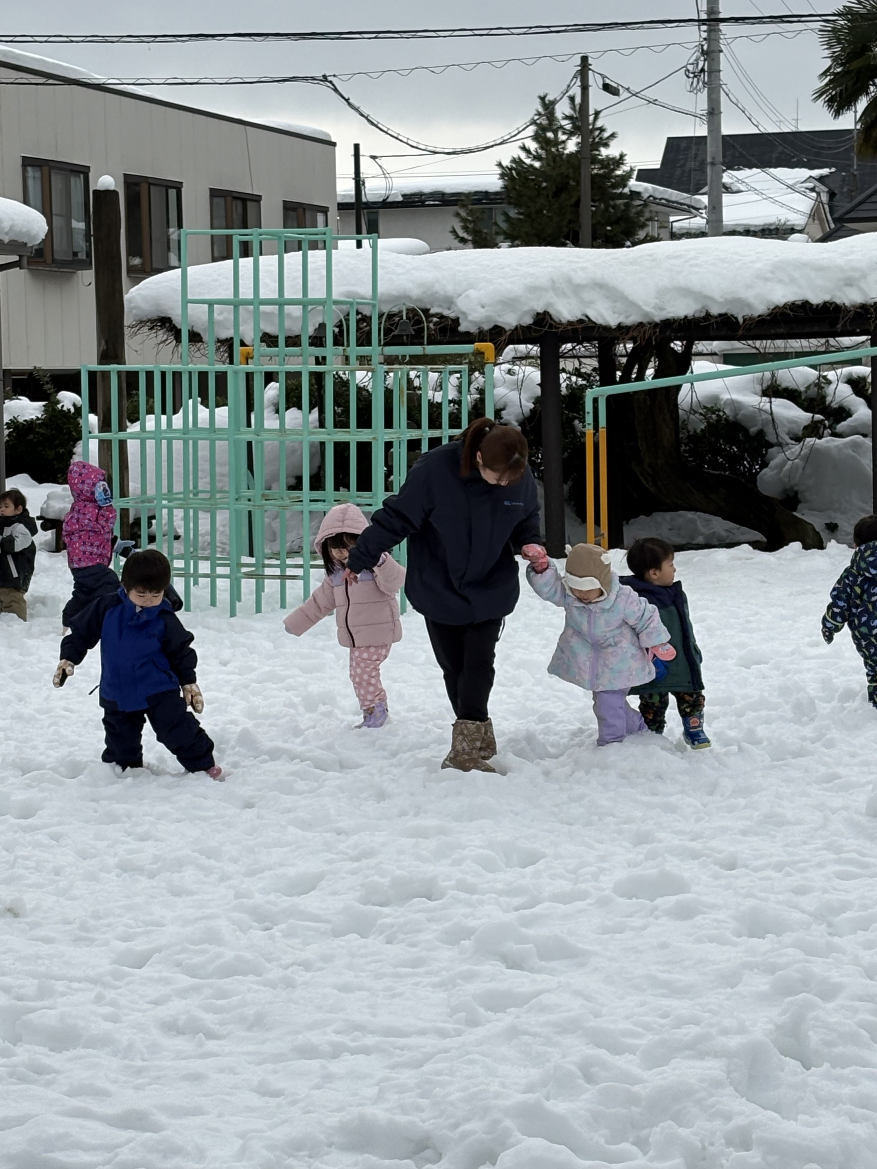 園庭は一面の銀世界☆ 子どもたちは築山からそりで滑ったり、かまくらを作ったり楽しんでいます。 小さいクラスの子どもたちは歩くのも一苦労です。