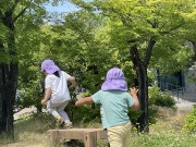 先日、ゆり組さんとお泉水公園に行ってきました。さくら組になって初めての園外保育なので、