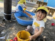 この間は泥んこ遊びをしました。水や砂をシャベルですくったり、水をパシャパシャたたいてみたりとても
