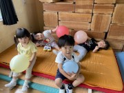暑くてなかなかお外に出られない日は、ホールで風船遊びやソフトブロックで遊んでいます。