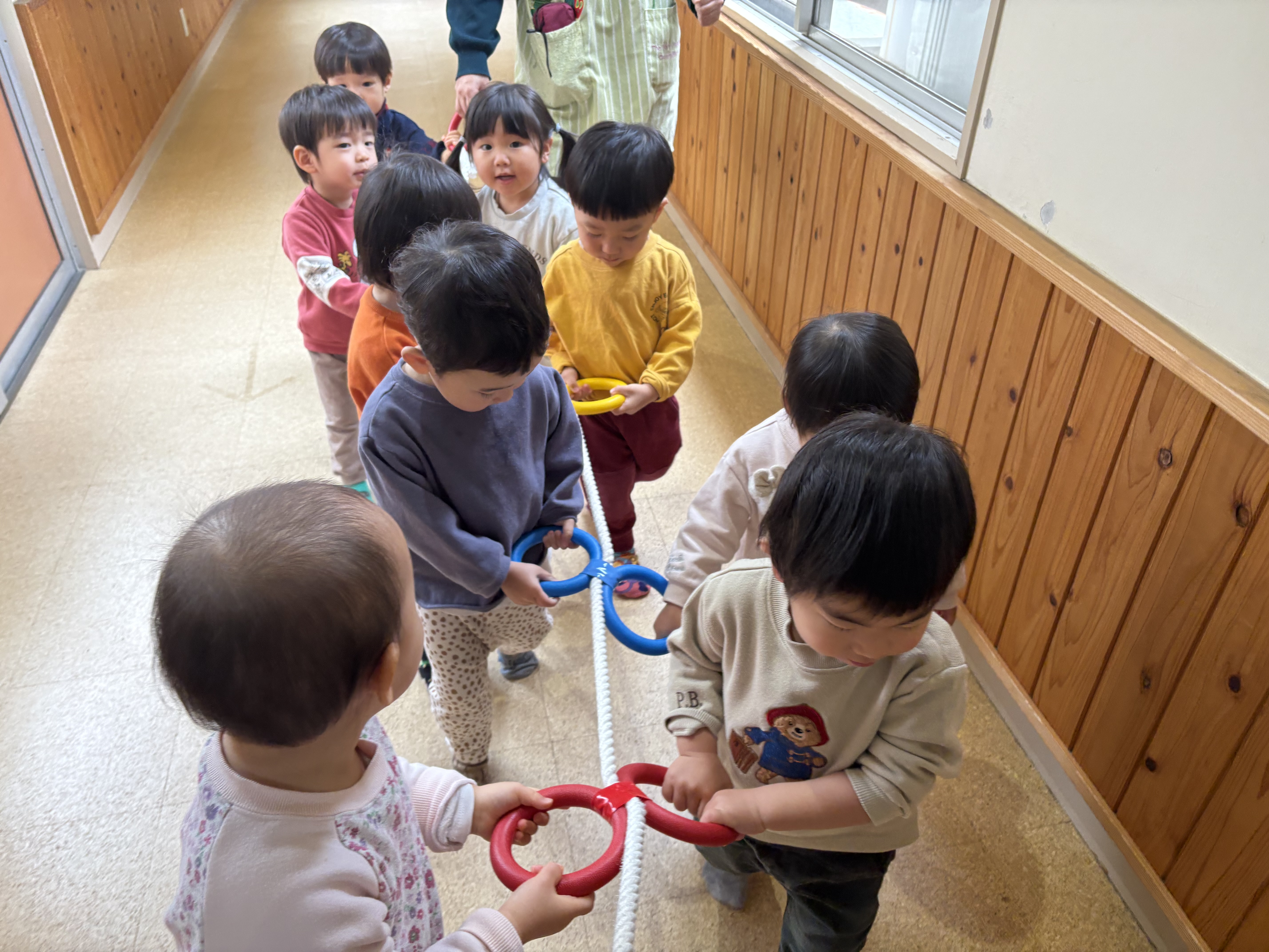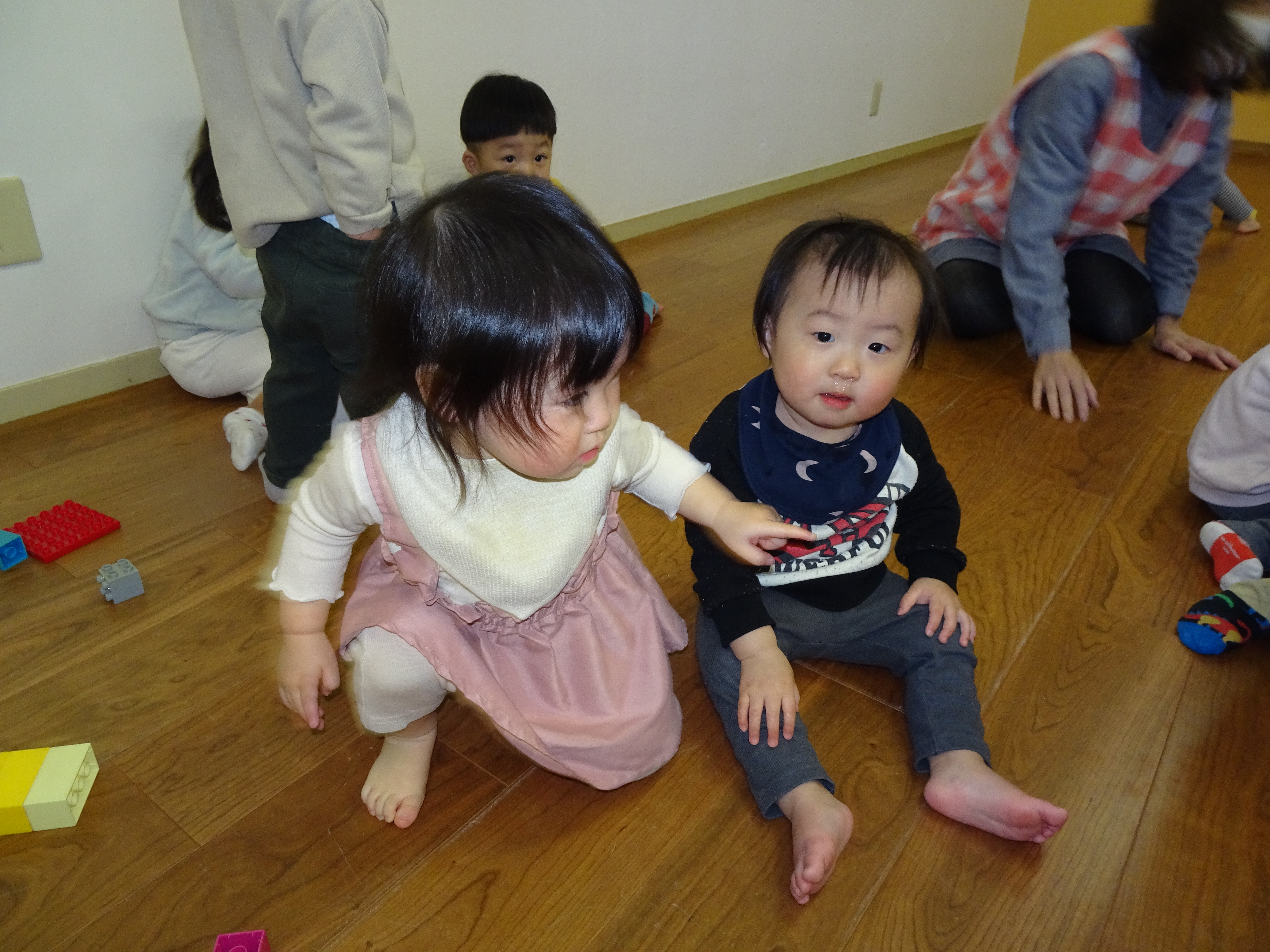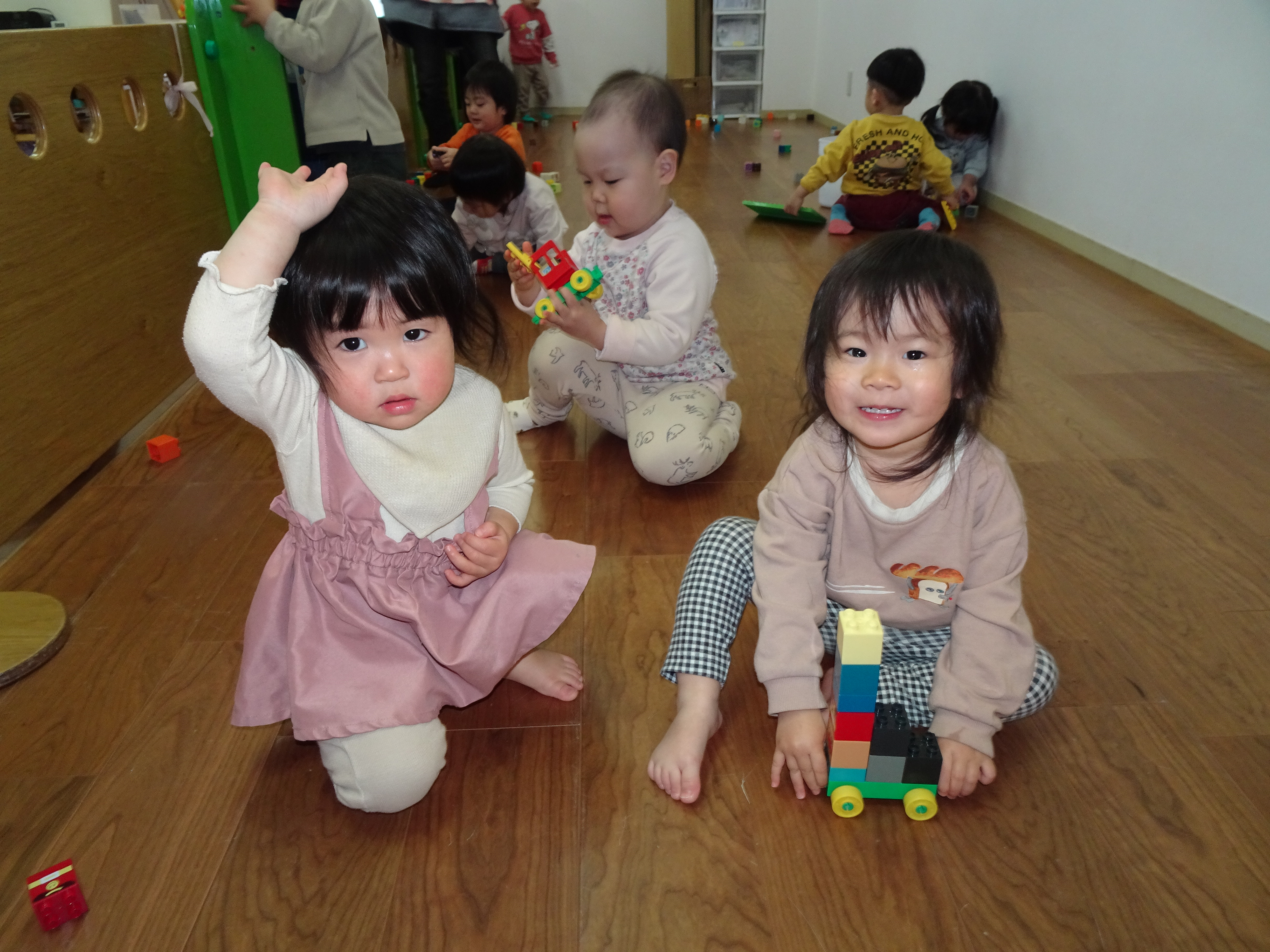 その後はすみれさんのお部屋で遊びました。0歳児さんも一緒に遊びましたよ。4月からドキドキわくわくですね☆