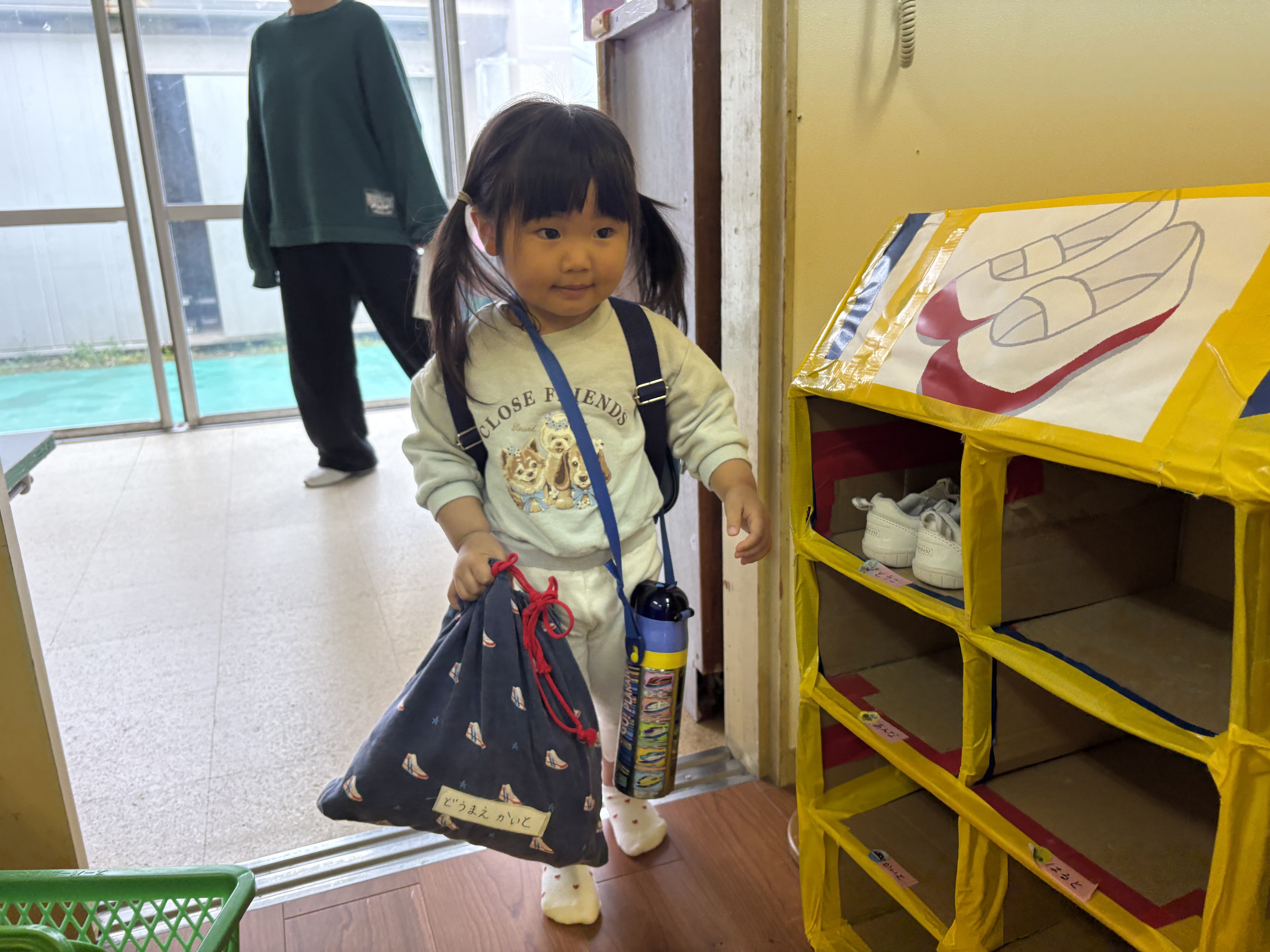 もうすぐすみれ組になるので、先生から園児玄関から入ることや朝のご用意の仕方など教えてもらいました。みんなとても張り切って水筒や連絡帳をお片付けしていました!